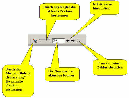 Alle Objekte der aktuellen Seite zeigen immer die Parameter, die dem aktuellen Frame (aktueller Datenposition) entsprechen. Nächstes Bild zeigt die Möglichkeiten die Ihnen zur Verfügung stehen, um diesen Zeitpunkt bzw. den aktuelle Frame zu bestimmen und automatisch zu steuern.