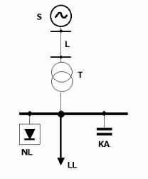 Hierbei bedeuten: S - externes Stromversorgungssystem, L - Übertragungsleitung, T - Transformator, NL- nichtlineare Last, LL- lineare Last, KA - Kompensationsanlage. Angenommen es wurden in diesem Knoten Messungen der Spannungsqualität durchgeführt und anhand der Messergebnisse und anderer Informationen die Gesamtlast des Knotens in zwei Arten unterteilt, was in der Praxis fast immer machbar ist: