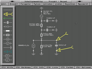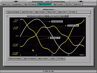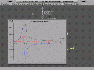 Stromquelle variiert werden, um die entsprechenden Ausschnittsnummern einzustellen. Zur Kontrolle des Stroms und des Leistungsfaktors empfiehlt es sich, den Analysator zu benutzen. Damit das möglich ist, müssen entsprechend Meßpfeile an den gewünschten Stellen der Schaltung plaziert werden. Bitte Beachten Sie auch, dass nach der Durchführung von Berechnungen mit dem Button "Frequenz" eine Liste geöffnet werden kann, in der die