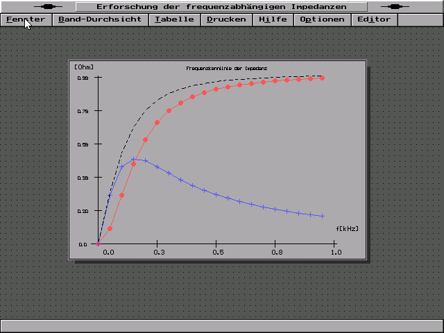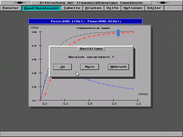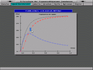 Mit Hilfe des Buttons "Fenster" kann man die Größe und die Lage der Graphen verändern. Eine besonders wichtige Funktion kommt dem Button "Band-Durchsicht" zu. Damit kann man nämlich die Widerstandswerte in den einzelnen Graphpunkten betrachten und außerdem hat man die Möglichkeit, bestimmte Bereiche der Graphen nach Wunsch "einzuzoomen" um diese näher betrachten zu können.