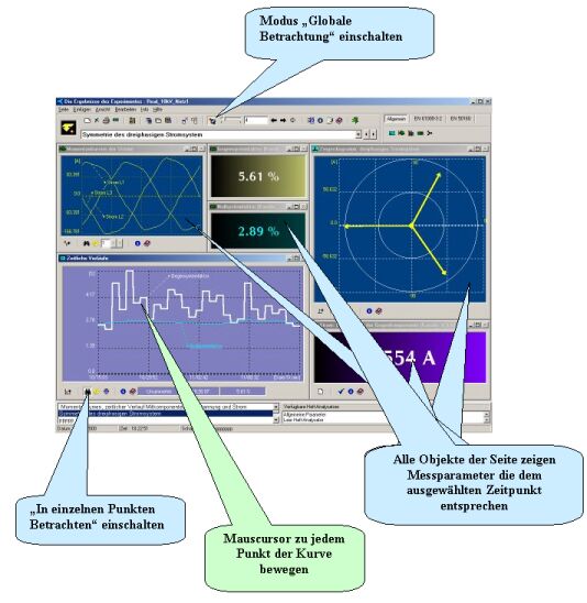 Bei der Analyse der Messdaten ist es häufig wichtig, den Zusammenhang zwischen den einzelnen Besonderheiten im zeitlichen Verlaufe eines Parameters mit anderen Parametern genau zum aktuellen Zeitpunkt zu untersuchen. Diese Möglichkeit leistet der Modus "Globale Betrachtung".