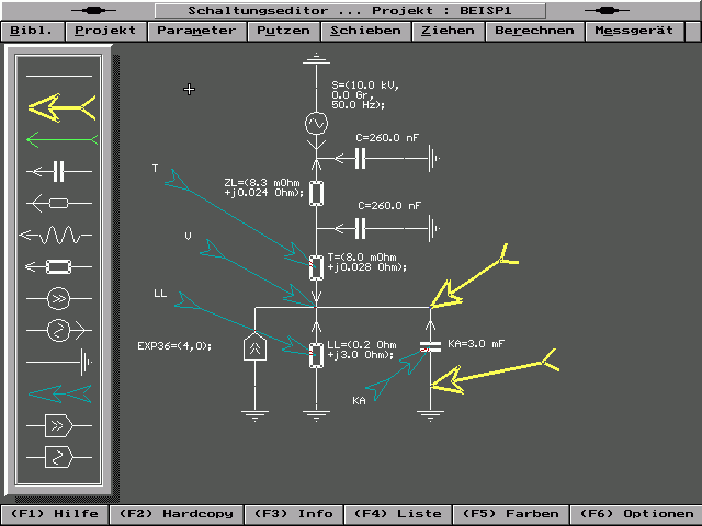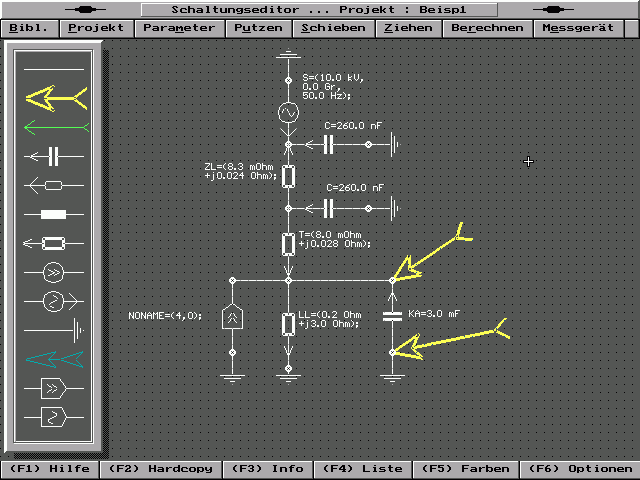 Das externe Stromversorgungsnetz wird durch die Spannungsquelle S ersetzt, die Freileitung durch eine Längsimpedanz ZL mit zwei Erdungskondensatoren, der Transformator durch die Impedanz ZT. Die nichtlineare Last wird durch eine polyharmonische Stromquelle ersetzt, der die Messergebnisse des Experiments NONAME zugeordnet werden. Den linearen Teil der Last ersetzt die Impedanz ZN und die Blindleistungskompensationseinrichtung ist durch den Kondensator CB vertreten. Die richtige Erstellung des Ersatzschaltbildes ist ein sehr wichtiger Punkt. Ebenso wichtig ist auch die richtige Wahl und Eingabe der Parameter. Diese beiden Punkte werden in vielen Literaturquellen beschrieben, z. B. [1, 2].