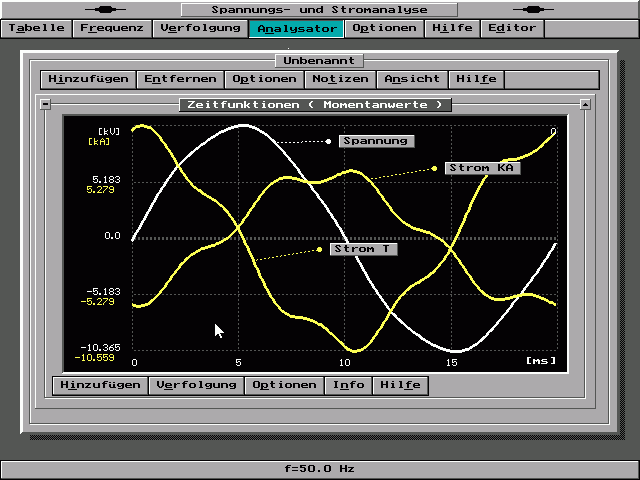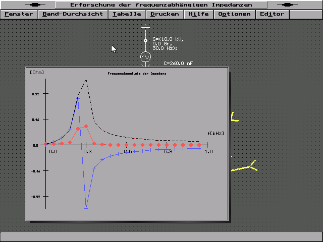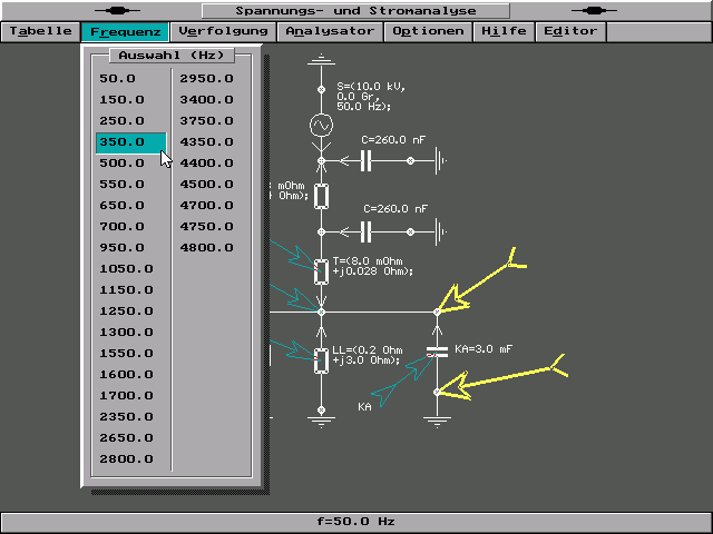 .Wie man sieht, schneidet die blaue Kurve(der Blindwiderstand) im Bereich der 5. Oberschwingung (250Hz) die x-Achse(bzw. die f-Achse). Dort kann man die Resonanzfrequenz ablesen. Durch die Änderung der Kapazität des Kondensators kann man diese nach rechts oder nach links auf der Frequenzenskala in den Bereich verschieben, wo eine entsprechende Oberschwingung im Strom der nichtlinearen Last fehlt. Falls eine einfache Kapazitätsänderung nicht zum gewünschten Resultat führt, kann man in Reihe mit dem Kondensator noch zusätzlich eine Spule anschließen um den Strom durch den Kondensator zu begrenzen. Die Kontrolle des Stroms durch den Kondensator muss zumindest für die beiden Fälle der maximalen und der minimalen Belastung durchgeführt werden. Dazu müssen die Parameter der polyharmonischen Stromquelle variiert werden, um die entsprechenden Ausschnittsnummern einzustellen. Zur Kontrolle des Stroms und des Leistungsfaktors empfiehlt es sich, den Analysator zu benutzen. Damit das möglich ist, müssen entsprechend Meßpfeile an den gewünschten Stellen der Schaltung plaziert werden. Bitte Beachten Sie auch, dass nach der Durchführung von Berechnungen mit dem Button "Frequenz" eine Liste geöffnet werden kann, in der die Frequenzen aufgelistet sind, die von der polyharmonischen Quelle bereitgestellt werden und die Frequenz der Spannungsquelle des Versorgungssystems (50Hz). In dem Sie eine Frequenz aus dieser Liste auswählen, können Sie die Resultate der Berechnungen speziell für diese eine Frequenz kontrollieren.