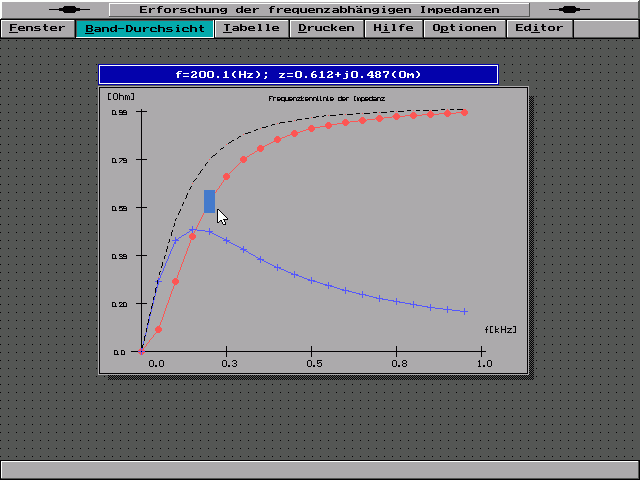 Mit Hilfe des Buttons "Fenster" kann man die Größe und die Lage der Graphen verändern. Eine besonders wichtige Funktion kommt dem Button "Band-Durchsicht" zu. Damit kann man nämlich die Widerstandswerte in den einzelnen Graphpunkten betrachten und außerdem hat man die Möglichkeit, bestimmte Bereiche der Graphen nach Wunsch "einzuzoomen" um diese näher betrachten zu können.