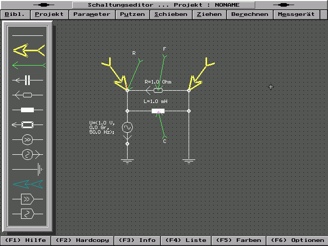 und die beiden anderen auf die Mitten der Schaltelemente Spule bzw. Kondensator ! Danach muss jeder Pfeil einen in der Schaltung einzigartigen Namen bekommen. Die Namenvergabe geschieht genauso wie die Parametereingabe bei allen anderen Schaltelementen(s.oben). Der einzige Unterschied besteht darin, dass es sinnvoll ist die Namen der Pfeile neben ihren