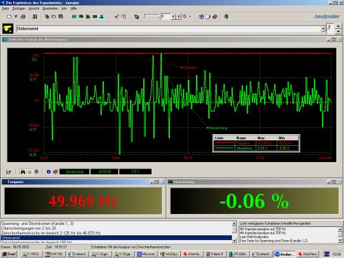 Grüne Kurve und der Indikator auf dem Bild zeigen die Abweichung der Netzfrequenz vom Nennwert 50 Hz als Zeitkurve und als Momentanwert.