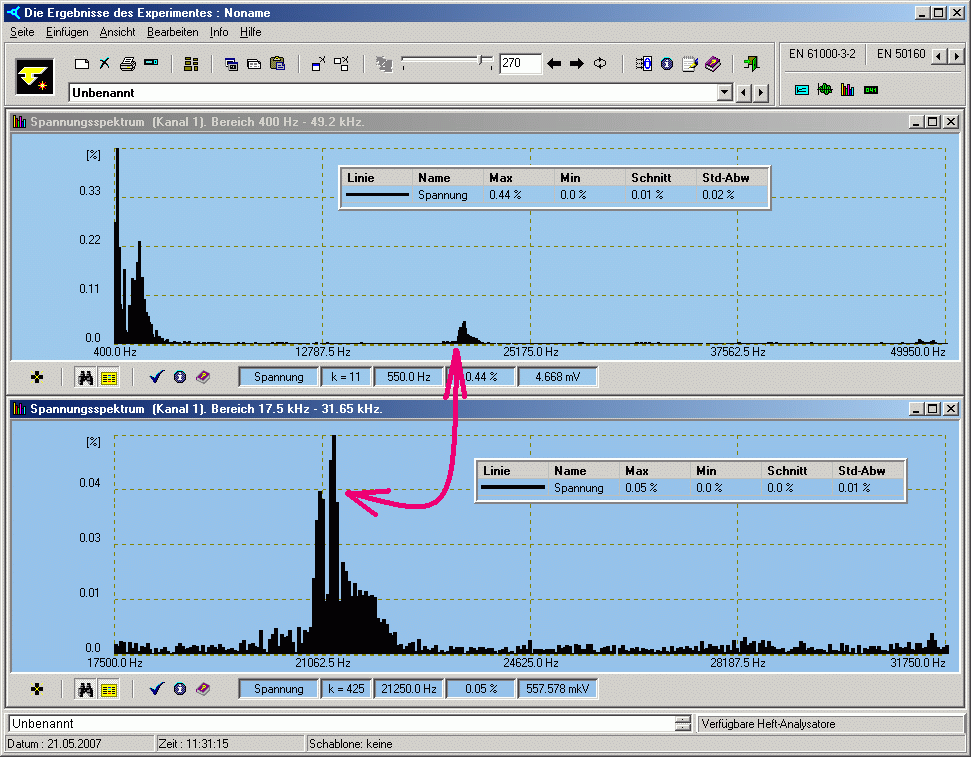 Der untere Graph zeigt ein Spektrum dass einen Ausschnitt aus dem Spektrum oben darstellt. Auf diese Weise kann der Anwender für verschiedene Frequenzbereiche getrennte Objekte im Abbildungssystem platzieren und mit beliebigen weiteren Objekten ergenzen.
