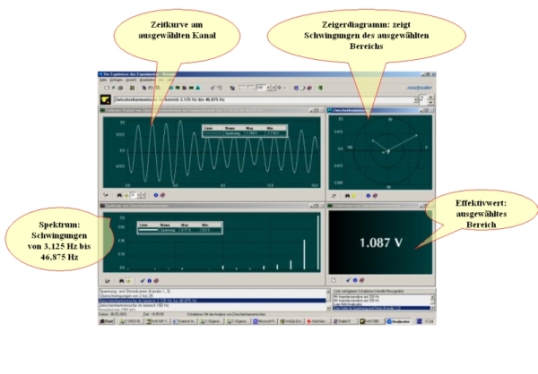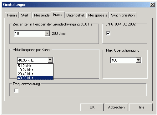 Dieses Bild zeigt z.B. Messwerte für den Bereich von 3.125 Hz bis 46.75 Hz. In diesem Frequenzbereich bilden sich auch Werte die für die Flickeranalyse und Spannungsschwankungen von großer Bedeutung sind. Die Analyse kann nicht nur mit der Standard-Frequenz 10,24 kHz , sondern auch mit Zwei- und Vierfachfrequenzen: 20,48 kHz und 40,96 kHz durchgeführt werden.